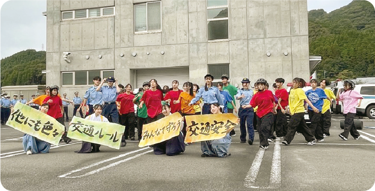 秋の全国交通安全運動(9月21日~30日)にあわせて、佐伯警察署で開始式が開催されました。今回の開始式では、市内の高校3校の生徒も参加し、書道やダンスパフォーマンスで交通安全を呼びかけました。また、来年から自転車の交通違反の反則金制度が開始されるため、交通安全のメッセージを伝えました。