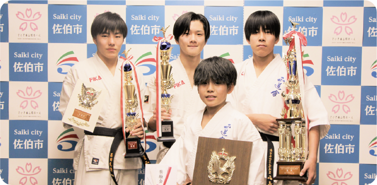 12/8(月) adidas SEIDO KARATE GP2025(全国)大会に出場する木許翔貴くん(渡町台小5年・前列)、木許樹希也くん(鶴谷中3年・後列右)、佐倉漣仁くん(佐伯城南中3年・後列中央)、西田礼彪くん(佐伯南中3年・後列左)が、大会前に市役所を訪問し、大会出場に向けた抱負を市長へ話してくれました。