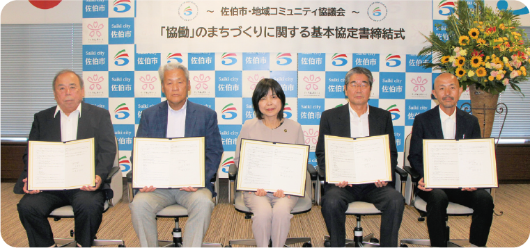 7/24(木) 今年度コミュニティ協議会の取組をスタートした下堅田・木立・上浦・本匠の4地域との『「協働」のまちづくりに関する基本協定書締結式』が行われました。 同日、昨年度協定を結んだ8地域を合わせた12地域で意見交換会が行われるなど、地域同士の連携を図り、まちづくりを進めていきます。