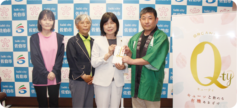 7/10(木) 「こどもたちに、もっと甘酒にふれてほしい」とぶんご銘醸株式会社から放課後児童クラブへ甘酒『Q‐ty(キューティ)』1,008本が寄贈されました。狩生孝之社長は、「甘酒を飲み慣れていない世代にも、甘酒にふれる第一歩にしてほしい。また、暑い日が続くので、健康増進にも役立ててほしい」と話しました。