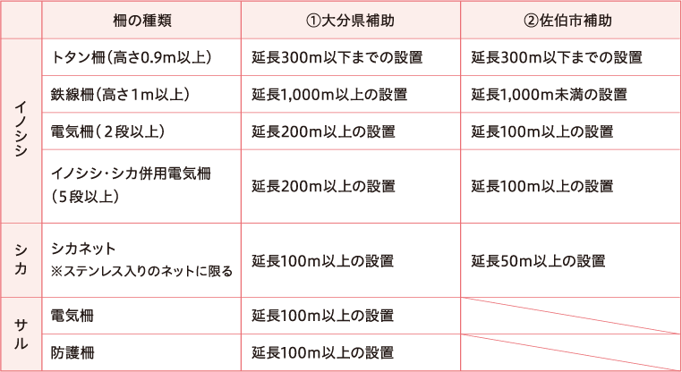 対象の鳥獣や柵の種類によって要件が違います。詳しくは以下のとおりです。