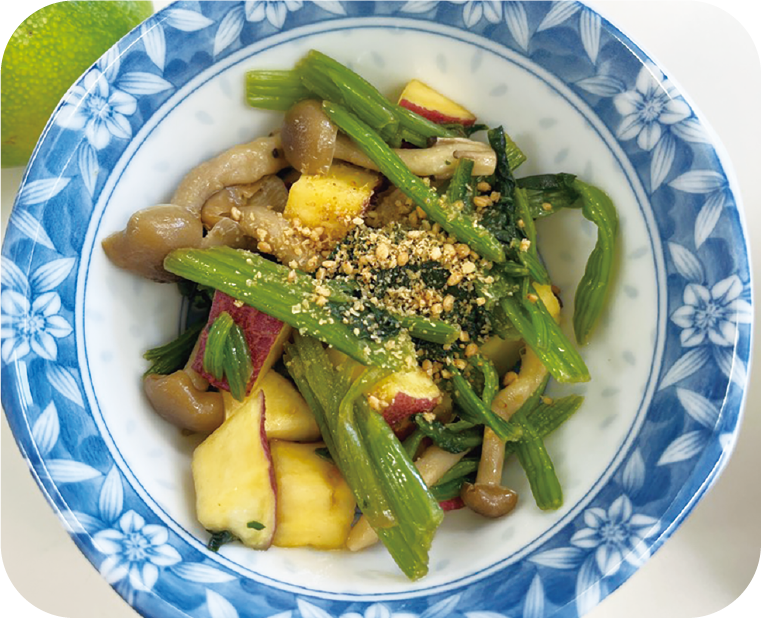秋が旬のきのことサツマ芋を使ったメニューです。酢を使っていますが、サツマ芋の甘味で砂糖を使わなくてもおいしく食べられます。