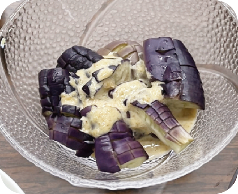 ナスは、格子状に切り目を入れるとドレッシングが絡みやすくなります。また、ごまドレは、ナス以外の野菜や茹でた豚肉にも合います。