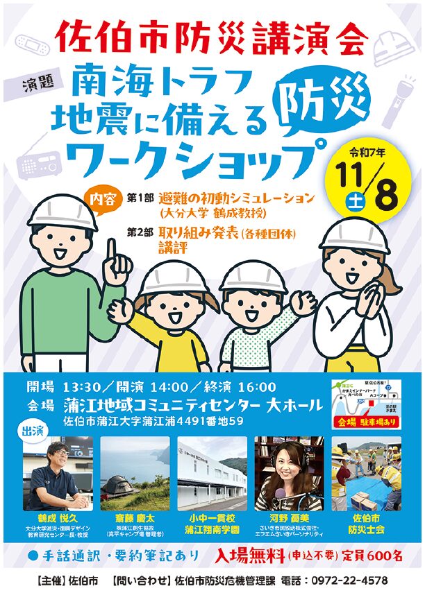 とき 11月8日㈯14時~(開場13時30分) ところ 蒲江地域コミュニティセンター大ホール 定員 600人 料金 無料(事前申込不要) お問合せ 防災危機管理課 防災推進係(本庁舎5階81番窓口) 📞22-4578