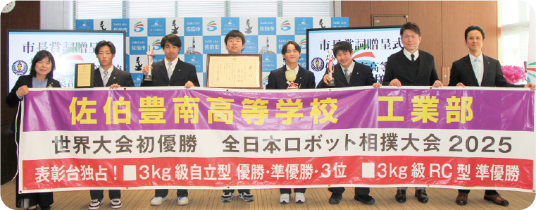 2/12(木) 12月に東京都で行われた「全日本ロボット相撲全国大会2025(3kg級自立型の部)」で表彰台を独占した佐伯豊南高校工業部へ市長賞詞が贈呈されました。この大会は、社会人チームや海外のチームも参加しており、土橋一揮くん(3年)は「世界レベルの証明ができてうれしい。支えてくれた皆さんに感謝です」と話してくれました。