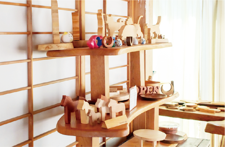 現在は、玄関ギャラリーに常時作品を展示するほか、市内外での個展、イベント出展など幅広く活動中。また、友人から持ち込まれた思い出の家具をリメイクしたり、災害時に寄附を呼びかける※1など、木工を通して人や暮らしにやさしく寄り添っています。
