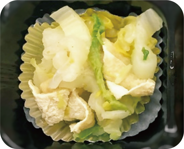 白菜は塩もみではなく、加熱して水気を絞ることで減塩になるだけでなく、優しい歯ざわりになります。